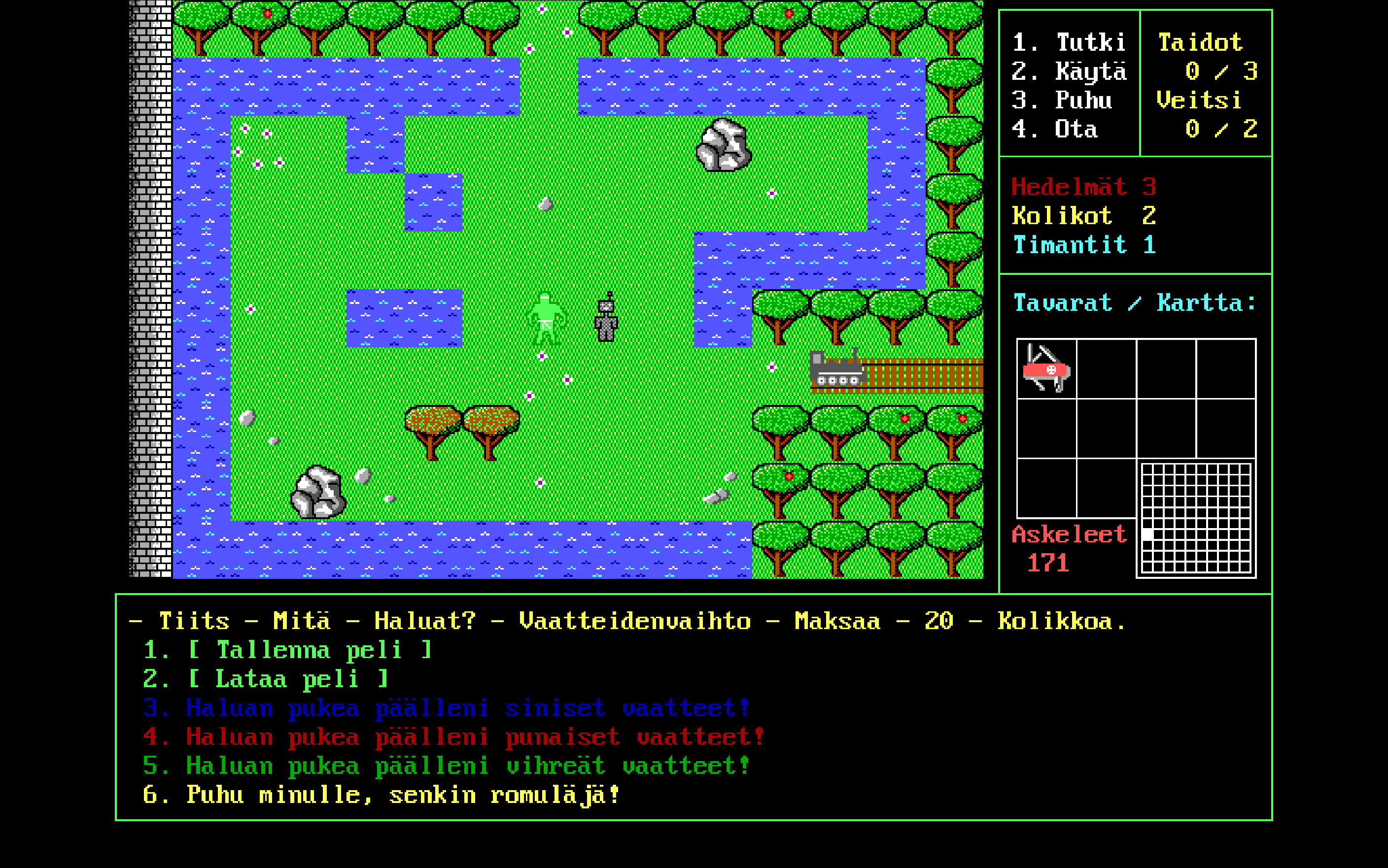 - Pelimies Remake is in Finnish and English, with added features such as autosave, new animations, dialogue improvements, improved layout, ability to start the game with ample resources, skills and items, playthrough instructions and world map